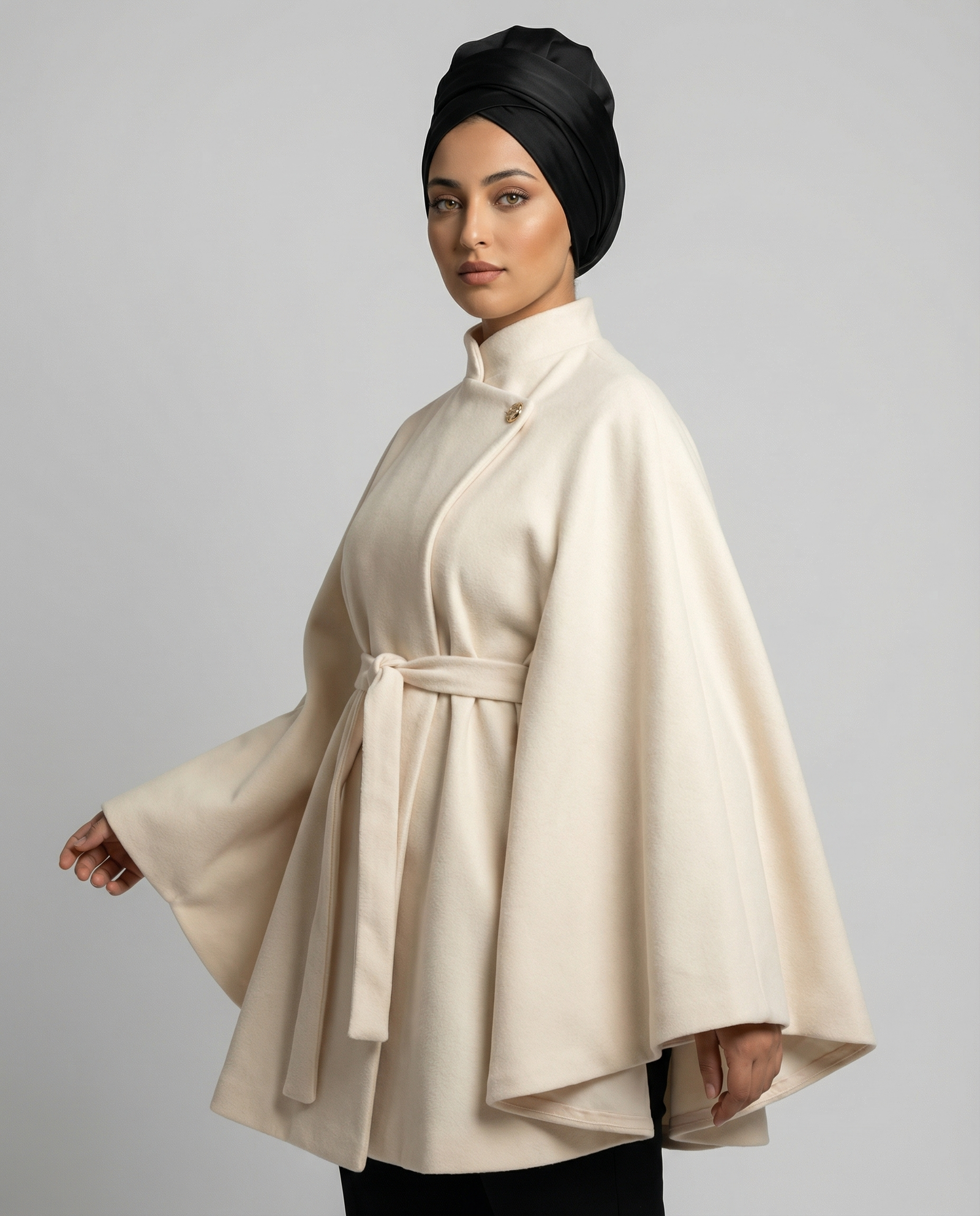 La lumière capturée en une pièce. Cette cape ivoire allie la pureté du blanc cassé à une amplitude sculpturale : une silhouette statement qui illumine sans effort, du bureau aux occasions spéciales.