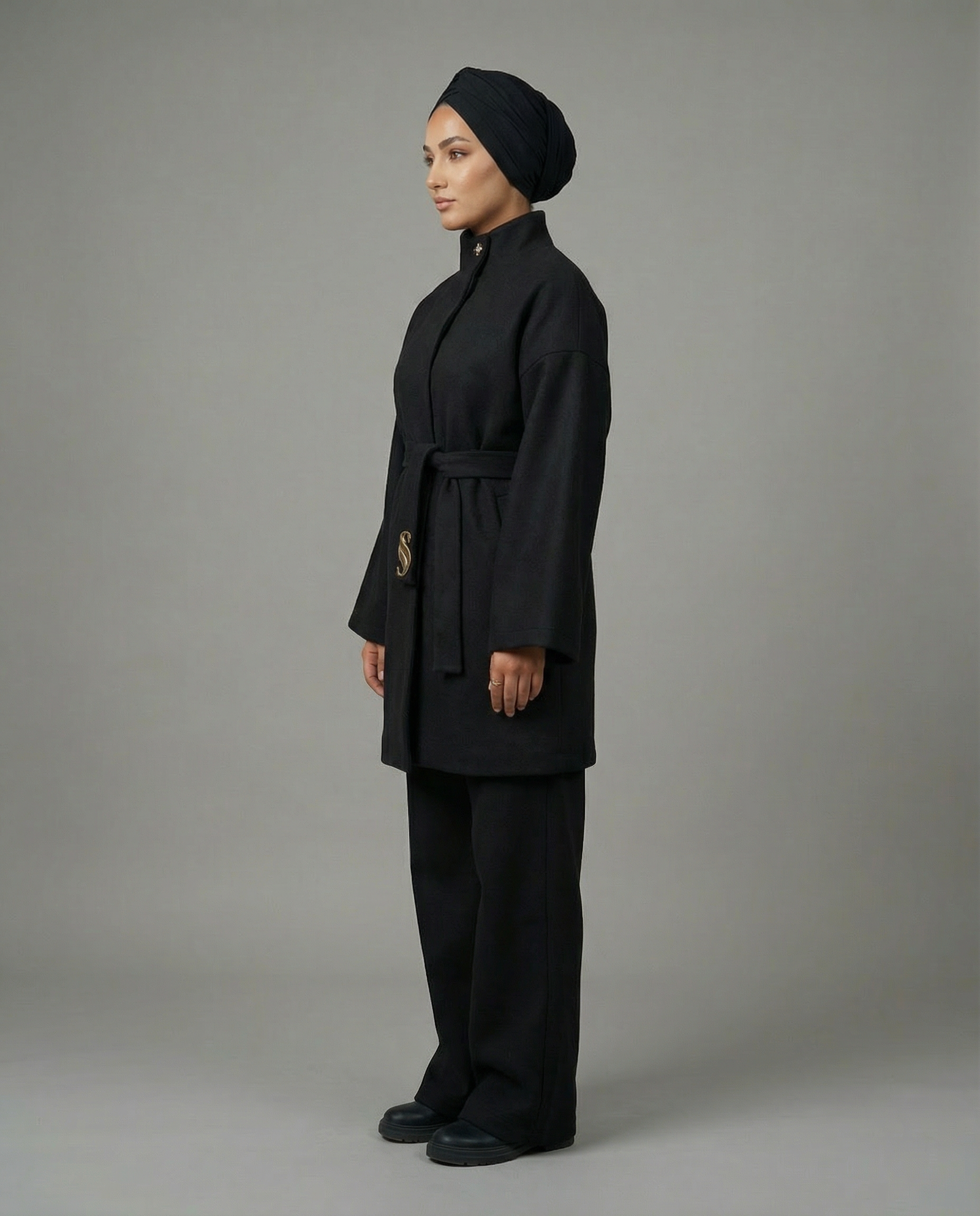 Le noir absolu dans sa version la plus architecturale. Cet ensemble veste-pantalon réinvente le tailleur classique avec une amplitude maîtrisée : une pièce statement qui traverse les codes avec assurance.