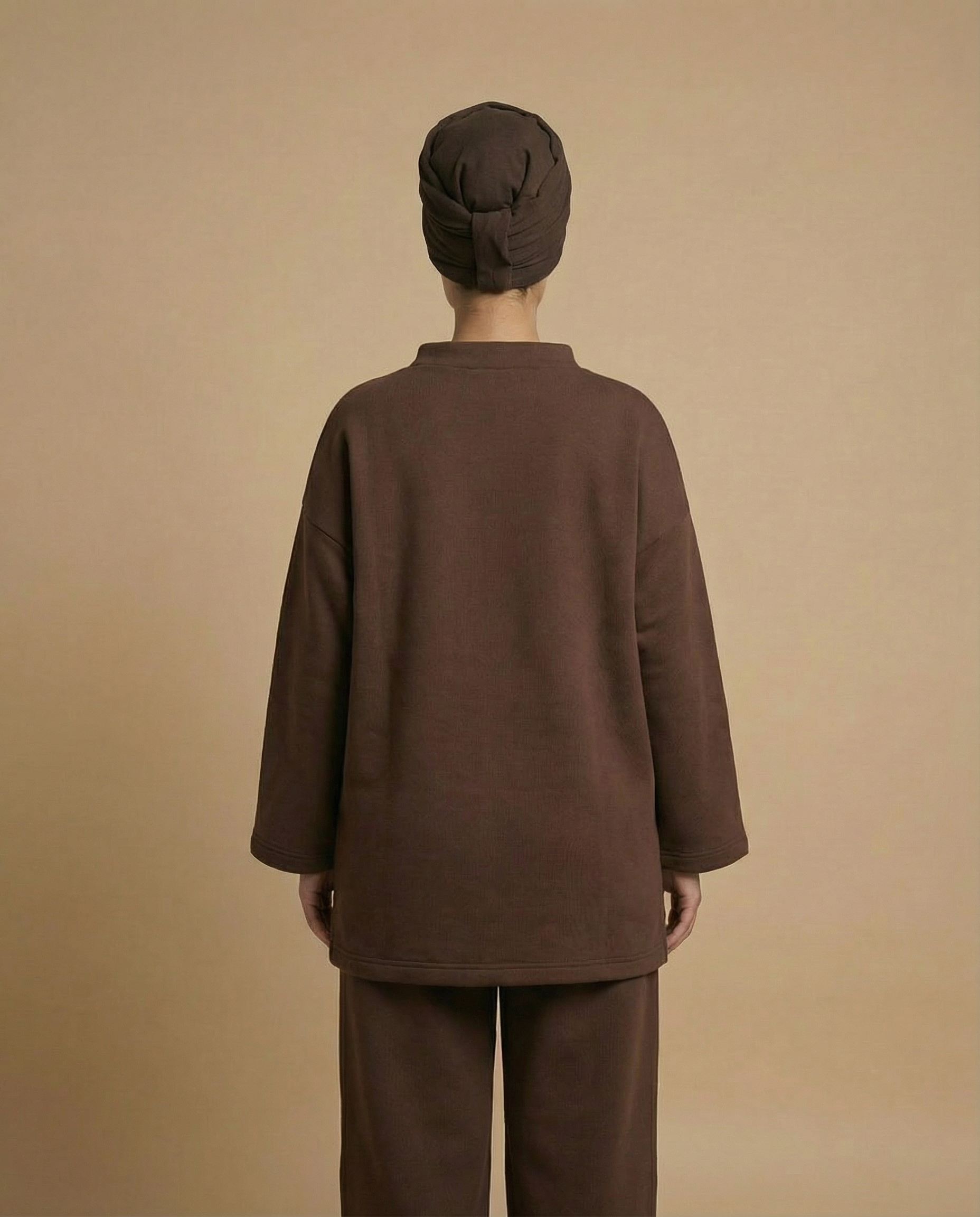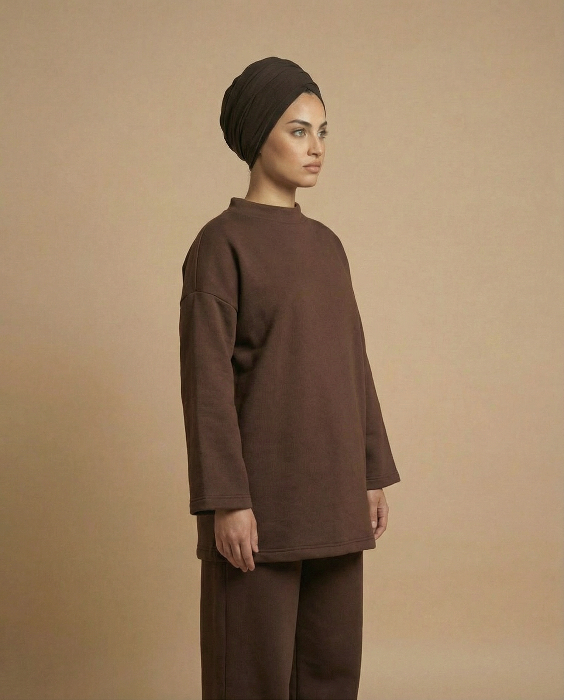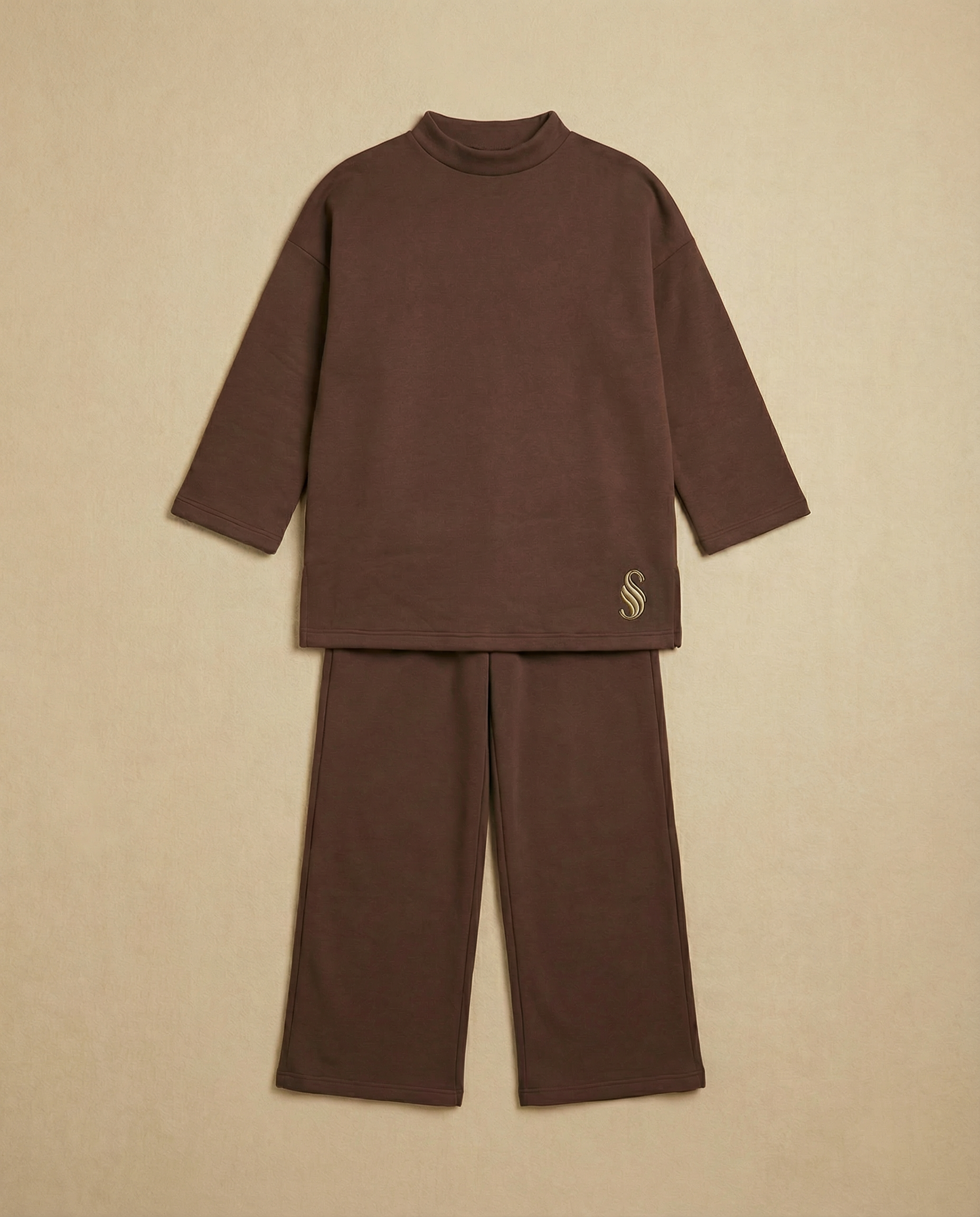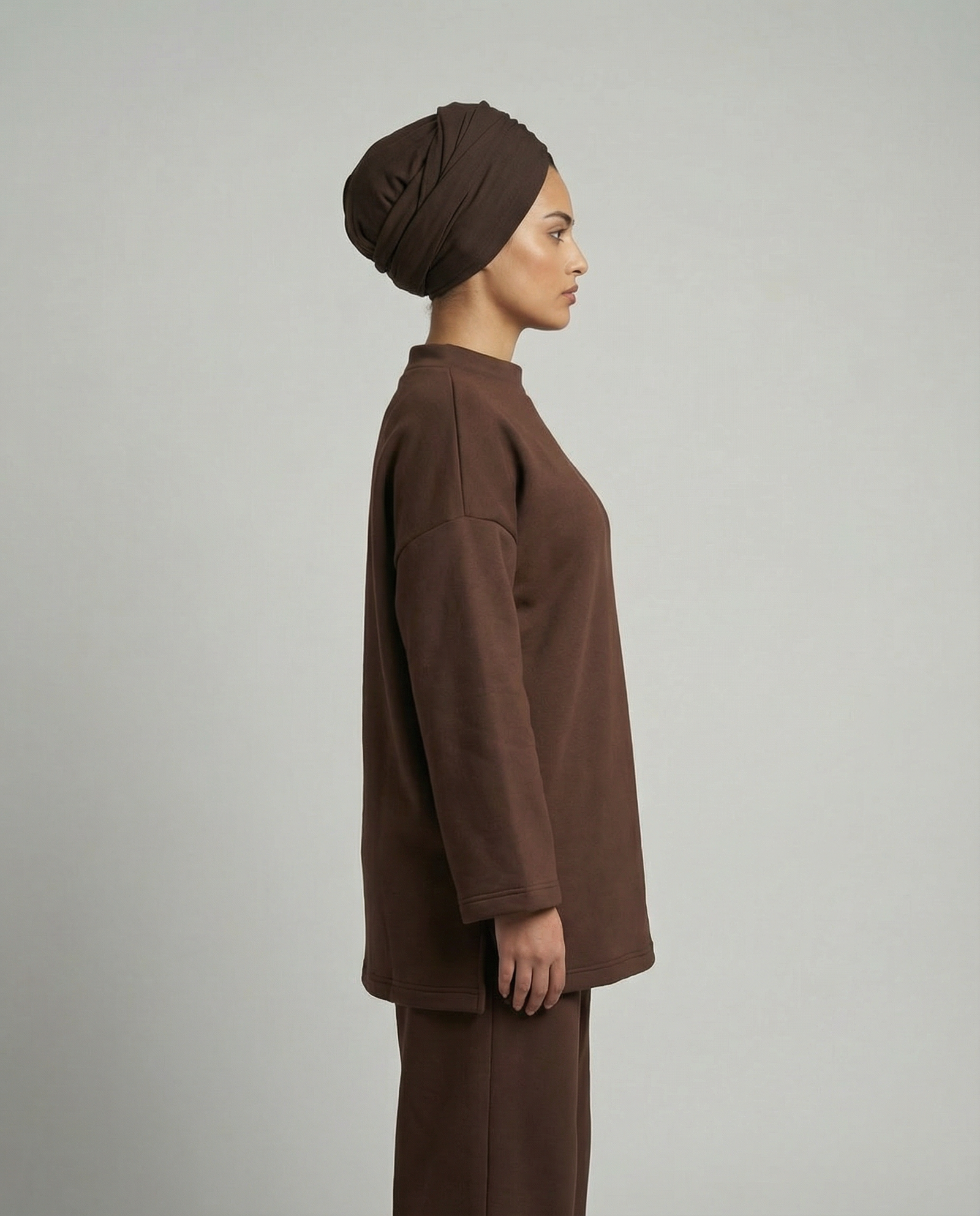 Le confort élevé au rang d’élégance. Cet ensemble sweat en chocolat profond réinvente le loungewear avec une coupe architecturale : suffisamment structuré pour sortir, assez confortable pour ne jamais vouloir l’enlever.