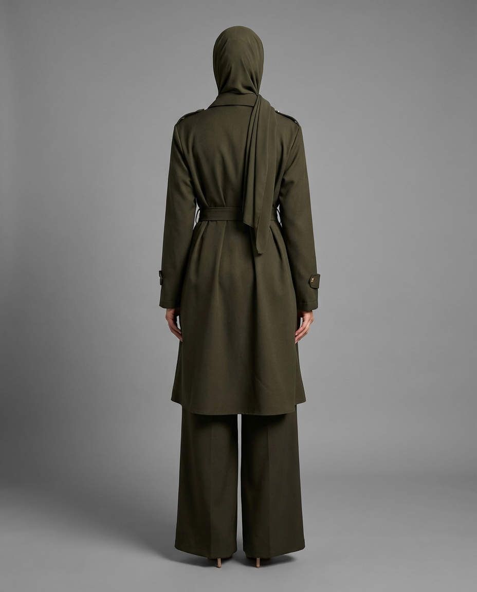 L’élégance militaire réinventée. Cet ensemble trois pièces conjugue la structure iconique du trench à la fluidité d’une silhouette pudique contemporaine. Col officier, ceinture sculptante et jupe évasée composent une tenue statement qui traverse les saisons avec la même assurance intemporelle.